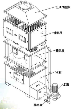 由于塔內(nèi)提供了良好的氣液接觸條件,氣體中的漆霧顆粒被水性液體吸收的效果好;氣體中的塵粒也易被水霧粘附而除去,此外,塵粒及霧滴受離心力甩到塔壁后,亦使之被粘附而除去,從而使氣流帶出塔的塵粒和霧滴很少。旋流板塔上部裝有組合除霧裝置,減少塔出口氣體帶水的危害。